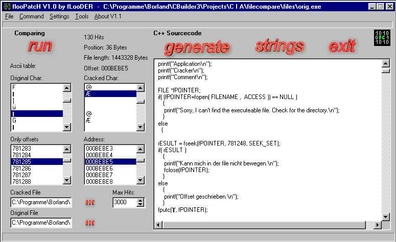 Features: - unlimmited search hits (shareware: 50) - comfortable offset saveing - auto sourcecode generation in C/C++ for a patch file - comfortable sourcecode saveing - sourcecode easily to comile with the standard dos C/C++ compiler - complete Win32 application - extra view for original and cracked bytes at the special offsets - modifying code (on the fly) of the cracked bytes |